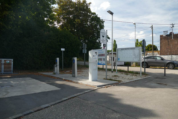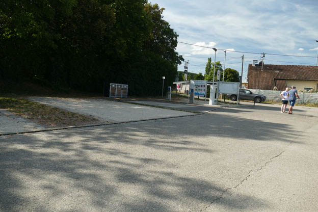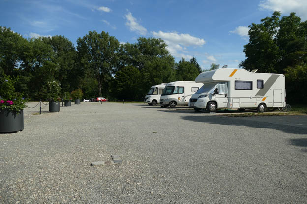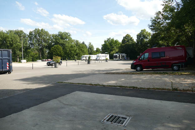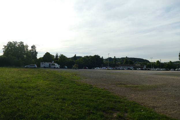 Ställplatsen är en del av en större parkering. Platserna är olika långa. Vi kom fram kl 16.00, och det fanns längre platser lediga, som tur var. På kvällen blev en lång plats och några kortare lediga. Floden Neckar flyter precis bredvid ställplatsen, men man ser den inte pga många träd och buskar.
