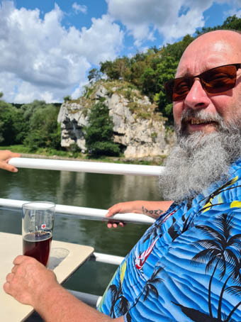 På båten kan man sitta både inomhus och utomhus. Det serveras öl från klostret (läsk finns också). Ute sitter man på bänkar längs borden, tre personer på vardera sida om bordet. Serveringspersonalen debiterar hela bordet för det man köper på båten, så det är bra om man kommer överens med sina bordsgrannar. Det har inte varit några problem när vi har åkt.