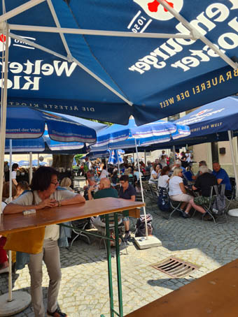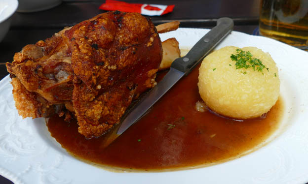 Det var väldigt mycket folk vid klostret. Vi ville äta, så vi ställde oss vid ett bord strax utanför restaurangen och spanade efter folk som såg ut att börja bli klara. Det var flera som gjorde så. När någon vid ett bord började resa sig gällde det att vara snabbast för att få bordet. Efter några försök fick vi tag på ett bord, och beställde deras secialitet: Grillhaxe mit Knödeln. Otroligt gott kött och sky, fast jag gillar inte potatismosklumpen. 35.60 € betalade vi för två portioner.