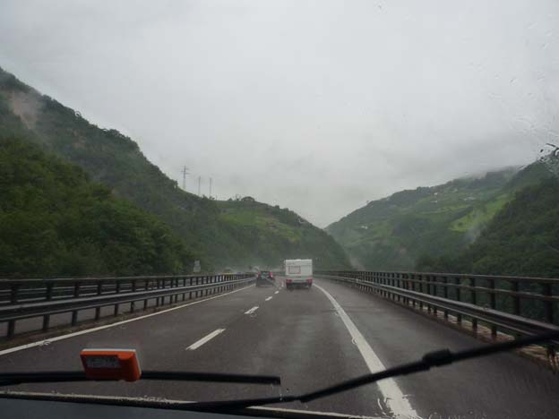 När vi åkte över Großglockner, fick vi problem med bromsarna, därför ville vi välja en väg med så lite backar som möjligt när vi åkte norrut igen. Valet föll på motorvägen, E45, genom Brennerpasset. Vi visste att det var extra vägavgift där, så vi hade tänkt betala den kontant, och spara på pengarna i GO-boxen. På grund av halvdålig skyltning, dimma, regn och dålig sikt lyckades vi hamna i fel fil, så det drogs en del pengar från GO-boxen i stället. Jag kollade upp priset när vi kom hem, (det går att göra på GO Maut), och det verkar som att Brennerpasset kostade 46.10 €.